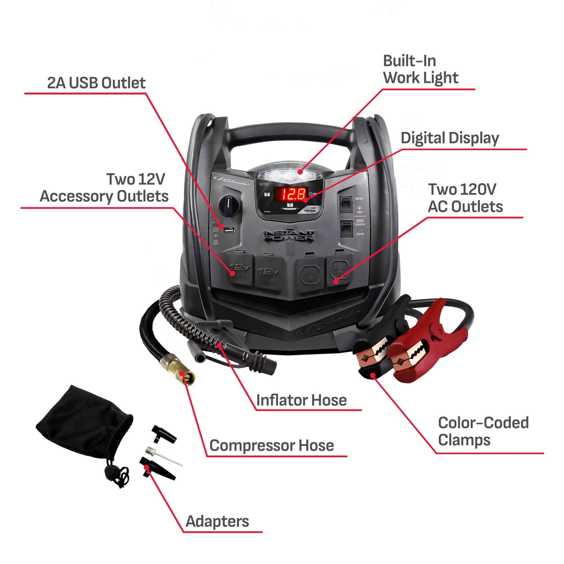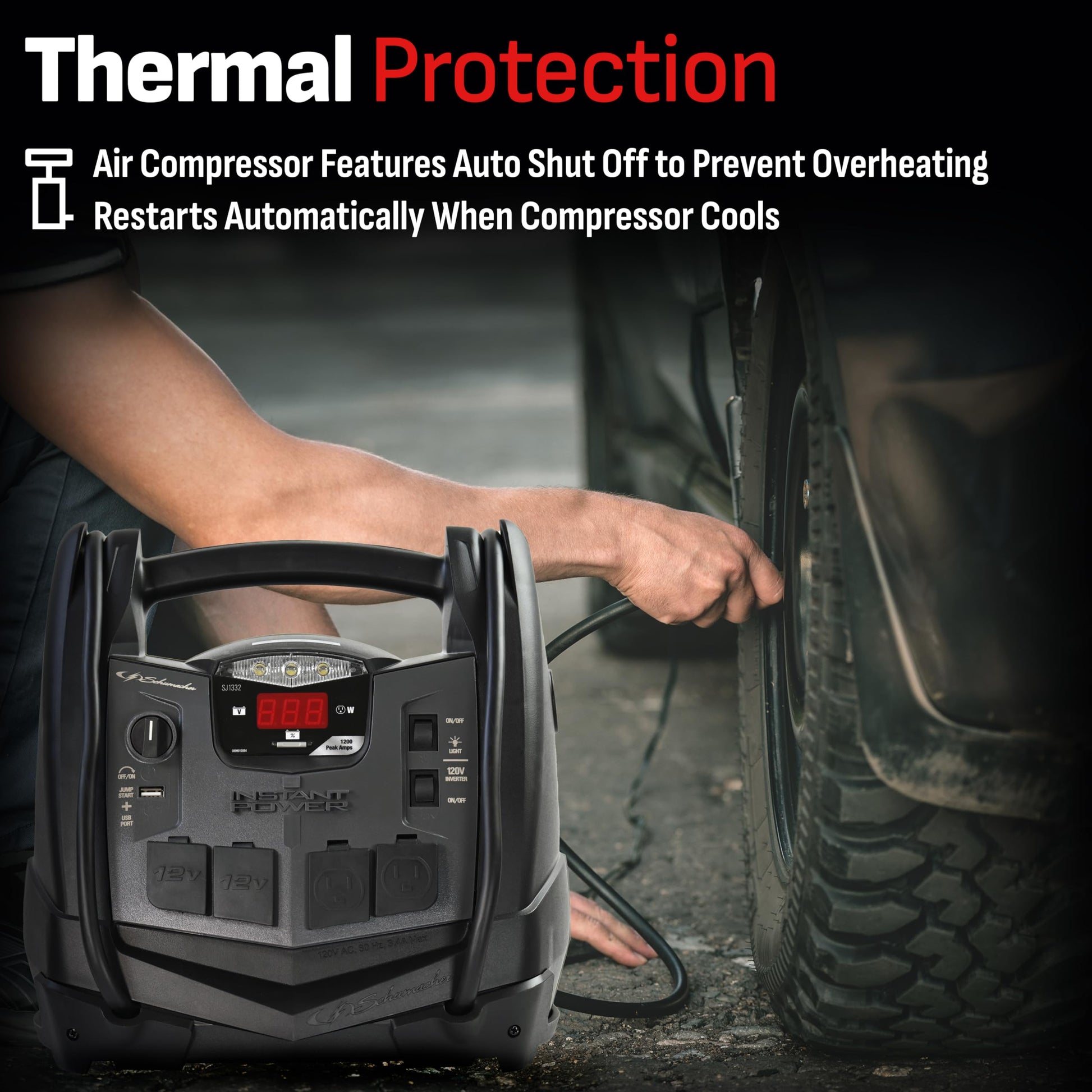 Schumacher Electric 1200A Car Battery Jump Starter and Portable Power Station, 6-in-1 Solution for 12V Batteries, 150-PSI Air Compressor, 200 Continuous/400 Peak Watt Inverter, SJ1332
